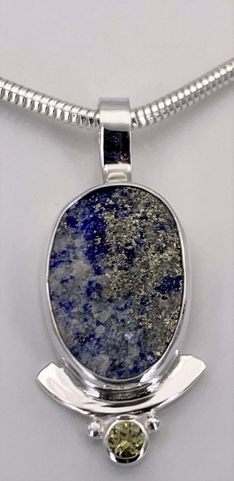 Lapis Lazuli with Pyrite and Calcite from Afghanistan, accented by a 4.25 mm Chrysaberyl. This pendant is in all silver and really makes a statement. Neutral enough to wear with a lot of different clothes choices and a real standout on its own. 1 6/8” in length.