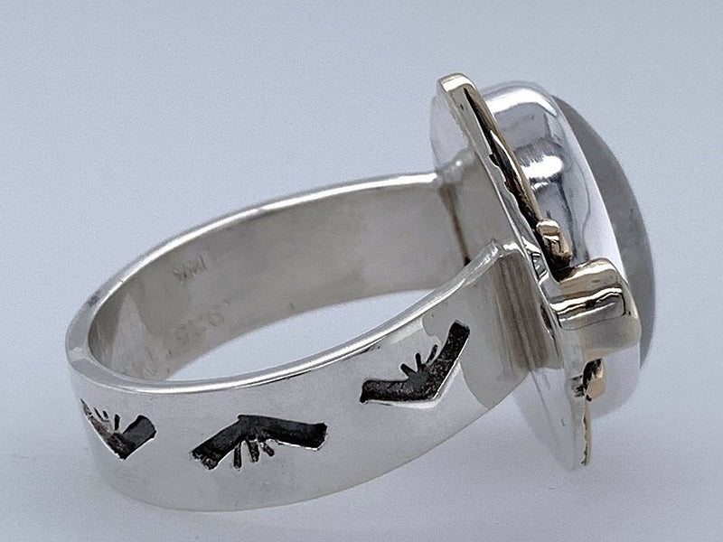 Rainbow Moonstone set in silver, accented with a Blue Zircon set in 14k gold and a 14k gold wire accent. Really stunning stone, eye catching. The band is silver.
